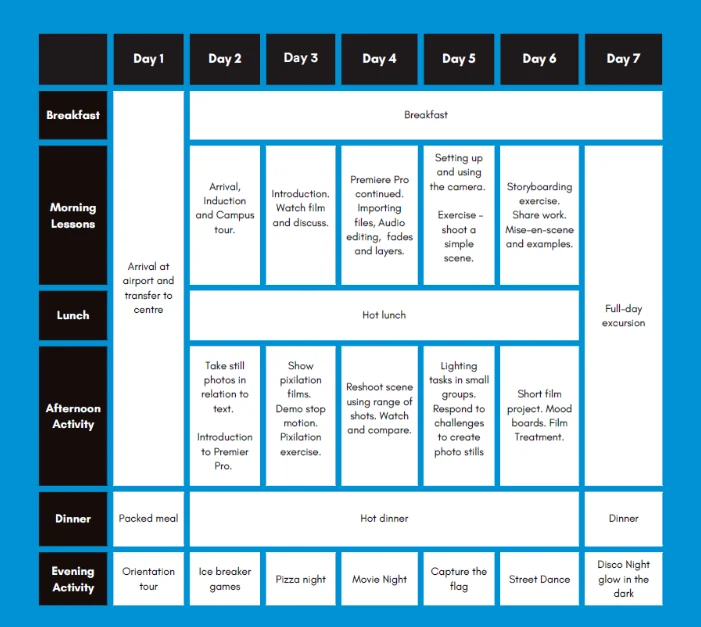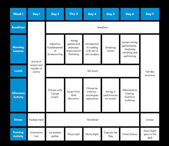 Gli studenti alloggiano nelle moderne residenze con i loro compagni di corso, immergendosi completamente nel loro progetto cinematografico e nell’esperienza del campo estivo. Il corso inizia il lunedì e termina il venerdì, gli studenti potranno entrare nella residenza la domenica prima dell’inizio del programma e partire il sabato successivo.